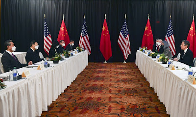 Yang Jiechi (center), a member of the Political Bureau of the Communist Party of China Central Committee and director of the Office of the Central Leading Group for Foreign Affairs, criticizes human rights issues in the US at the opening session of US-China talks in Anchorage, Alaska on March 18, 2021. Photo: AFP